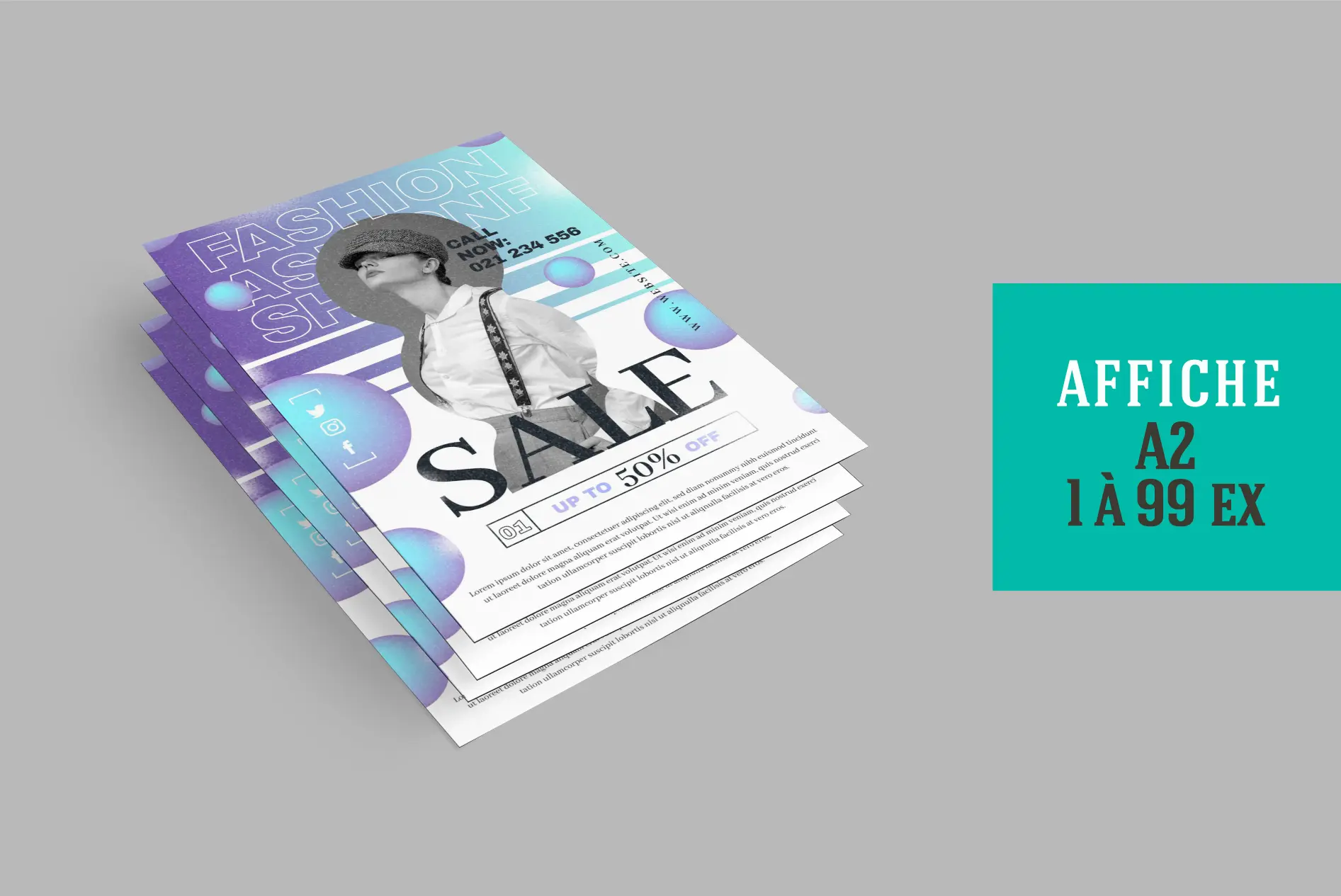 L'affiche A2 (42x59,4cm) est le format classique des affiches publicitaires pour la promotion d'événements : exposition, concert, festival, spectacle, etc ... Leur format compact les rend également faciles à placer dans des lieux stratégiques tels que les vitrines de magasins, les panneaux d'affichage, ou même à l'intérieur de votre établissement.